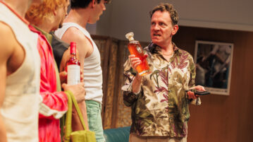 Inspired by Alfred Hitchcock’s […] Rope, […] Messy White Gays imagines a Hell’s Kitchen brunch during which the hosts must hide the body of their throuple partner in a Jonathan Adler credenza.
