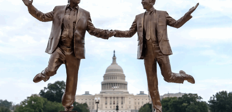 Besties Even if you’re avoiding the news, you probably saw this statue of Donald Trump and Jeffrey Epstein, which showed up on the National Mall last Sept. 23rd. Now known as “Best Friends Forever,” it was erected under a permit issued for “The Secret Handshake.” Twelve feet tall and fashioned out of foam, resin, wood, and wire and painted to look like bronze, the statue was removed by the Park Police the next day, but somehow it was rescued by the anonymous owners, after which it spent time in a number of locales, winding up in front of Busboys and Poets Café on 14th and V Streets in DC. Clearly the main point is to highlight the close ties between the two men, but it is of more than passing interest (at least for us) that they’re holding hands and dancing. And those backward kicks they’re both doing—can we tawk?