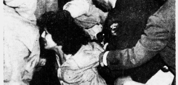 “Police handcuff rioting girl at Los Guilucos Friday Night.”