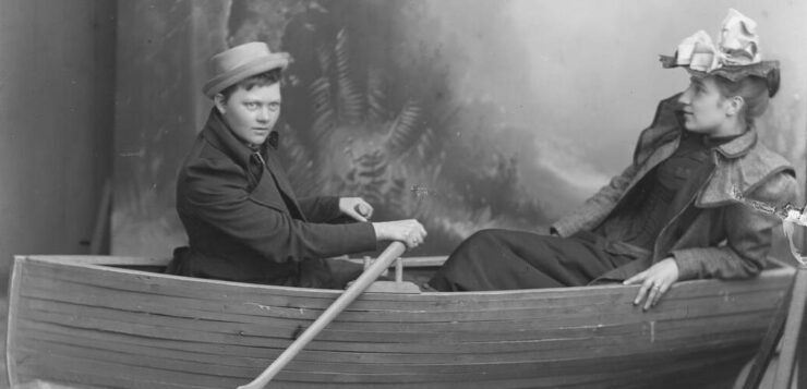 Høeg and Berg’s rowboat scene also brings to mind Abbéma’s contemporaneous double portrait with Sarah Bernhardt, set in a skiff on a lake in the Bois de Boulogne. Here, however, the gender play is even more overt. Høeg, sporting male attire, holds the rowboat’s oars, while Berg, decked out in feminine finery, leans back against the stern. The stagy backdrop evokes a woodland setting; a ground cloth bunched around the hull of the rowboat enables us to imagine a turbulent stream. The couple’s hands, clearly visible, display what appear to be identical wedding bands. Although Høeg and Berg’s tableau has a tongue-in-cheek edge, unlike Abbéma’s grandiose double portrait, the photograph also, nonetheless, immortalizes a lesbian love story.