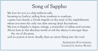 My love is Sappho’s elegies, strings, a storyteller of valleys and sorrows. About how in this absolute world of evil the silence is stronger than the cry of dry grass,