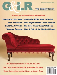 DSMdecision and its aftermath. He suggests that most psychiatrists at this time still believed that homosexuality was a mental illness but grudgingly voted to delist in an APA-wide vote the following year. After that, the medical model fell into fairly steep decline, and the APA has been a leading opponent of “conversion therapy” for many years. The collapse of the medical model invites the question of where it came from initially, and a thorough answer is provided in a reprised piece by Vernon Rosario, who traces the origins of “homosexuality” as a medical condition to late 19th-century Germany. It made its way from Europe to the U.S. and eventually into the first DSMin 1952. This was the era in which treatment for homosexuality included electro-shock, aversion therapy, and even chemical castration. Indeed “the couch” was only the mildest intervention that was used. Clearly the APA’s turnabout was a response to changes in “the Zeitgeist,” which was exploding with Women’s Lib, the Sexual Revolution, and post-Stonewall activism. Barbara Gittings embodied all of these strains as a radical lesbian feminist, and she was one of the people on the famous John Fryer panel (along with Frank Kameny). In a speech that’s reprinted here, she describes the background to the APA panel and the importance of its decision, which made it possible for the gay liberation movement to go forward, unencumbered by the stigma of mental illness. RICHARDSCHNEIDERJR. LET US celebrate the fiftieth anniversary of the American Psychiatric Association’s decision to delist “homosexuality” as a mental illness in its Diagnostic and Statistical Manual (DSM). This is the bible for psychiatric theory and practice, the arbiter of what is “normal” and what is pathological, so the inclusion of homosexuality was a constant drag on any effort by gay people to gain social acceptance or to organize a political movement to that end. The reversal came late in 1973 when the APA board voted to declassify homosexuality as a psychiatric condition. But the most dramatic and memorable event came a year earlier at their annual meeting, which featured a panel of gay and lesbian activists, one of whom, John E. Fryer, appeared in a mask so that he could tell his story as a gay psychiatrist, which he did with passion and eloquence. This event was discussed in an article by Malcolm Lazin in our May-June 2022 issue, which elicited a letter to the editor from Lawrence Hartmann, a psychiatrist who played a major role in the decision to delist, who points out that the APA’s decision was the culmination of a lot of hard work and persuasion inside the organization. In an Open Letter, Dr. Hartmann takes us behind the scenes and reveals what it took to get the board to reverse its position on a critical social issue. Another influential member of the APA, Jack Drescher, is interviewed in this issue about his extensive research on the Holiday Issue: ‘The Empty Couch’ FROM THE EDITOR 4 The G&LR JEWISH LES COLLECTED POE an ch CTIVIST BIAN A A t MS OF A PIVOTA en d political activist, Ir , viv ild Holocaust sur or ailblazing lesbian poe r L uth to t ce " # his - 8 a t, co eve ha “Ire he %, &, vid 31# each for tr nnect and r e y turn, a deep desir r t. A able hear s a vulner ant intelligen s vibr na’ able work. r incompar 11#%(8,- ," '"(5 5#2*) , ,7 8) (!# '*)( %,/+1#( oice. T merican v ual A +')4 8) 2 68(21 2-$ 8-$ h illu roub People in T ah Schulman, author ~Sar .” t ese pages anscend minates and tr ess.org Visit weslpr Call 800-537-5487 orite booksell our fav om y der fr Or le of s er examining A volume From n P $29 95 . many Ger twentieth-century in early and stigmatizatio ment empower caught between queer lives and Ka Edited by ersity of y the Univ ed b tribut Dis aper . olina Kühn r ff Mirjam Zado .ed s.uchicago ess www.pres Chicago Pr u